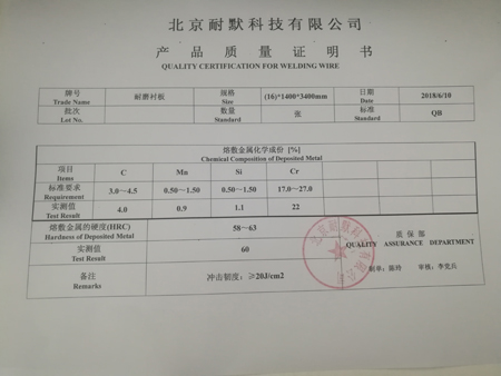 圖(1)堆焊耐磨襯板的合金成分材質(zhì)單也是產(chǎn)品質(zhì)量證明書(shū)